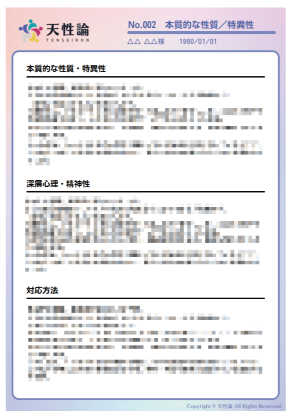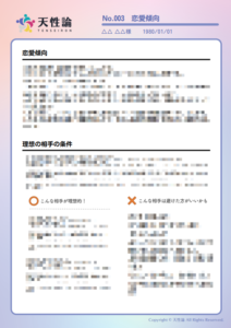 内容:対象者の特有のオリジナリティ、気質、深層心理の傾向性など